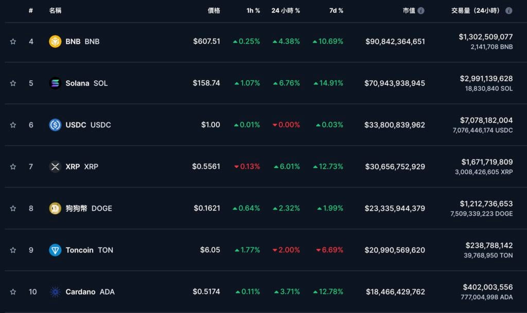 CoinMarkeCap 数据 显示 ,其他前十大代币近 24 小时多数也上涨,除了 TON 下跌 2 % 之外,SOL、XRP 都有超 6% 以上的涨幅、BNB 也成功突破 600 美元大关。