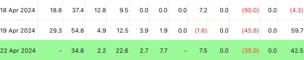 最后,从 Farside 统计 数据 来看,22 日比特币现货 ETF 的资金走向为净流入 4250 万美元。(贝莱德的 IBIT 尚未更新资料)