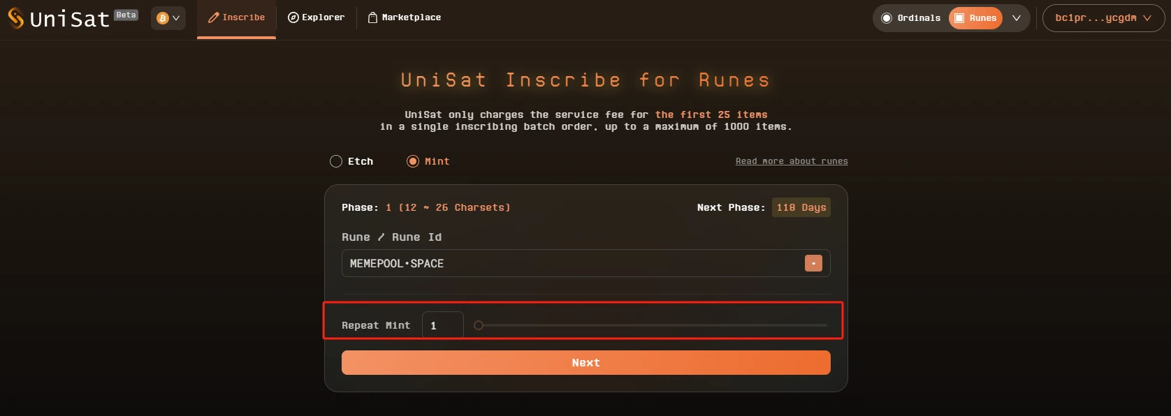STEP 2. 选择其中一个符文项目,下图以 MEMEPOOL•SPACE 为例(仅为演示需要,非投资建议),点击“Mint Directly”后选择重复次数即可。