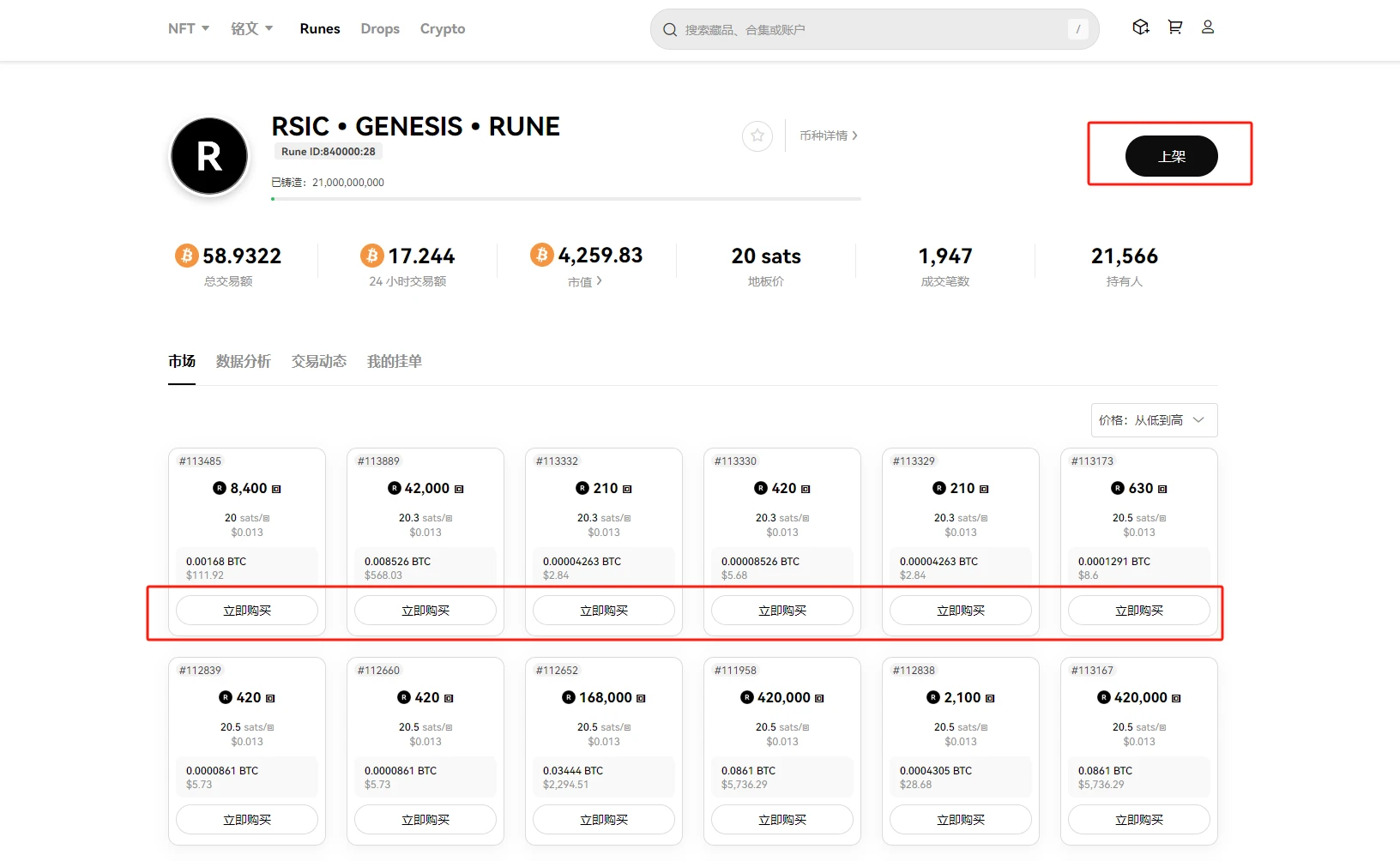 进入 交易市场板块 ,与 OKX Web 3 市场操作相同,选择需要购买或出售的符文(“购买”符文需要支付 Gas 上链完成,而“上架”挂单无需支付 Gas)。