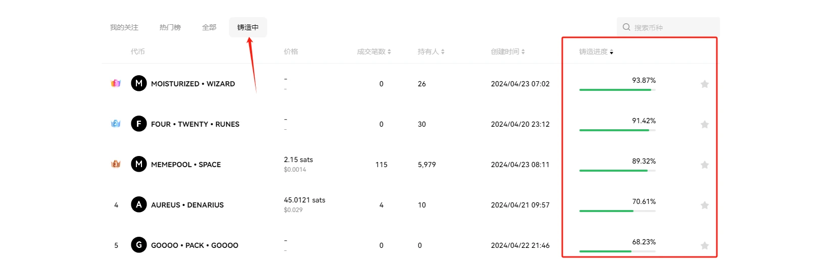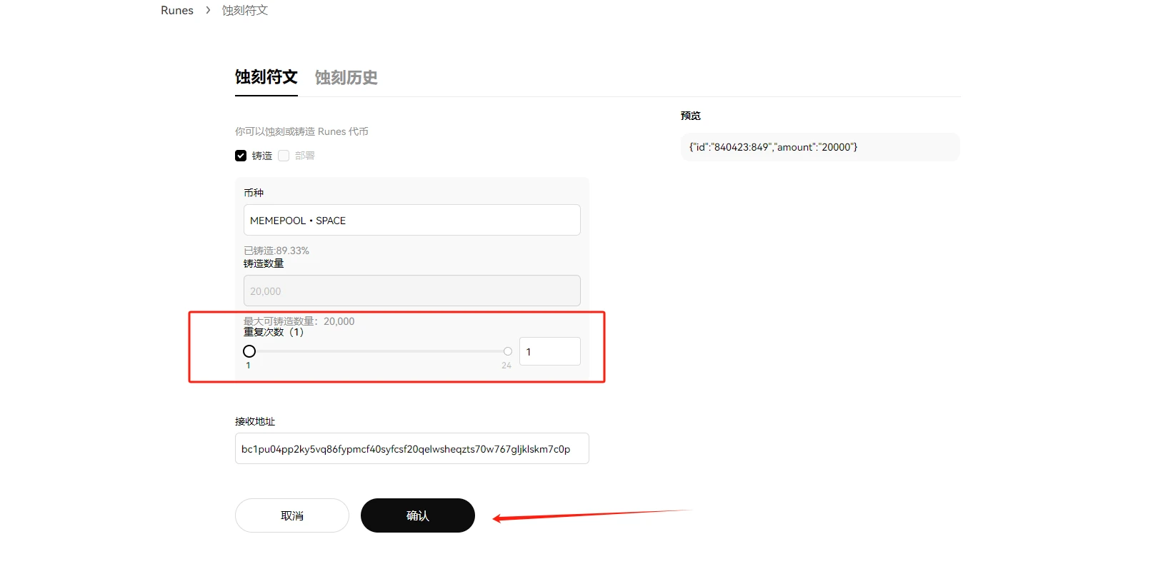 STEP 2. 选择其中一个符文项目,下图以 MEMEPOOL•SPACE 为例(仅为演示需要,非投资建议),点击“铸造”后选择重复次数即可。