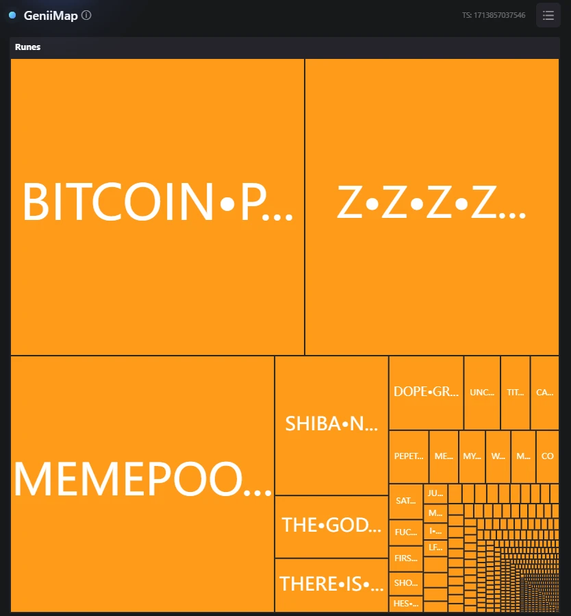 一方面,查看当前 BTC 网络热门项目。下图的 BRC-20 板块热力图,相信大家并不陌生,铸造铭文时就会看到各个社区在发。通过该热力图可以知道当前热度高的项目是什么。下图所示,所占面积越大,表示前交易池中该符文有关的交易最多,也就说明很多人在购买或交易该符文。