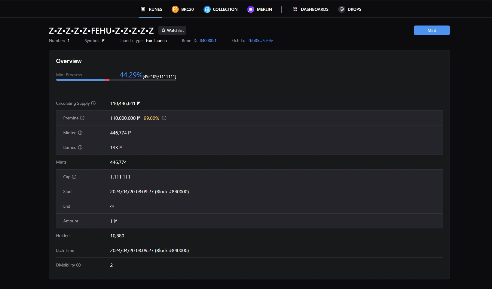 另一方面,查看某个 BRC-20 项目的基本信息。通过点击热力图可以查看对应项目的基本信息。如下图所示,符文项目 Z•Z•Z•Z•Z•FEHU•Z•Z•Z•Z•Z 开始铸造的时间为 4 月 20 日 08: 09: 27 (Block 高度为 840000),当前铸造 44.24%。 同时,在页面下半部分可以看到目前该符文的持有者持仓情况等信息。