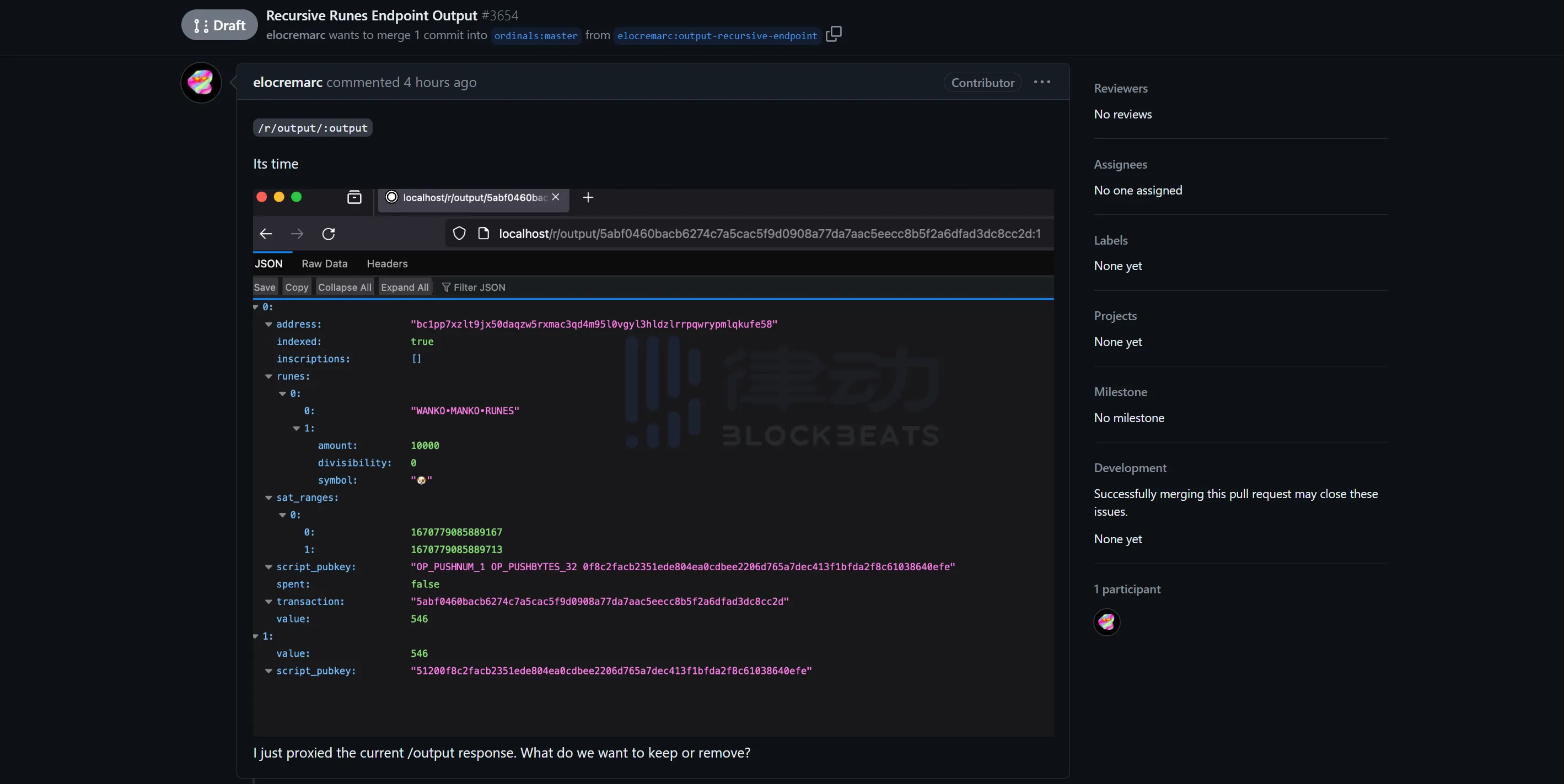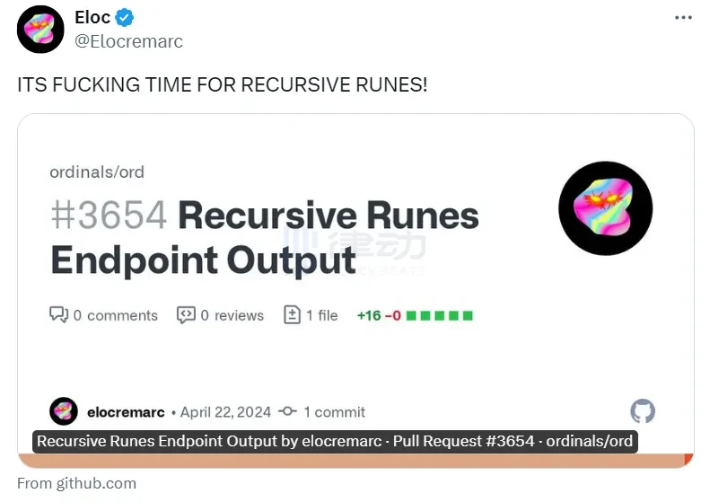 最后要再提一下,「/r/output」这个递归端点被添加,是 @Elocremarc 这个方案的先决条件。目前,@Elocremarc 已经在 Ordinals 官方的 Github 上提交了 PR,如果顺利通过了,我们就有「递归符文」玩了。