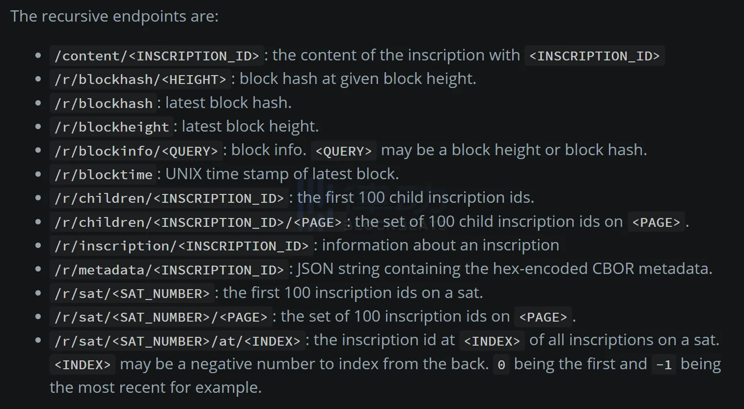 「递归」的作用大家应该都有所了解,「链上指针」,可以让铭文引用比特币链上数据,包括其它铭文的数据。支持引用的数据有以下这些,包括最新区块高度、指定区块高度、其它铭文的数据等等,这些也被称为「递归端点」。