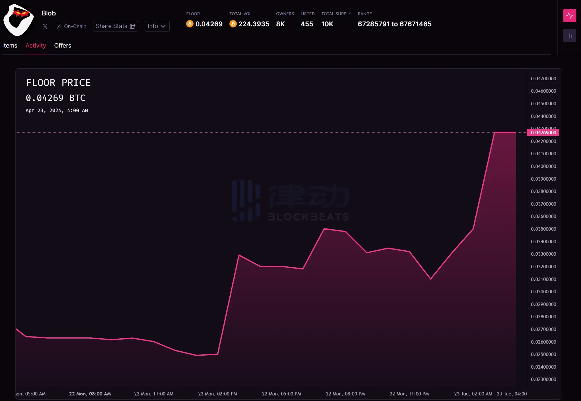 在小编写这篇文章的时候,Blob 的地板价已经应声上涨了 30% ,突破了 0.04 比特币。