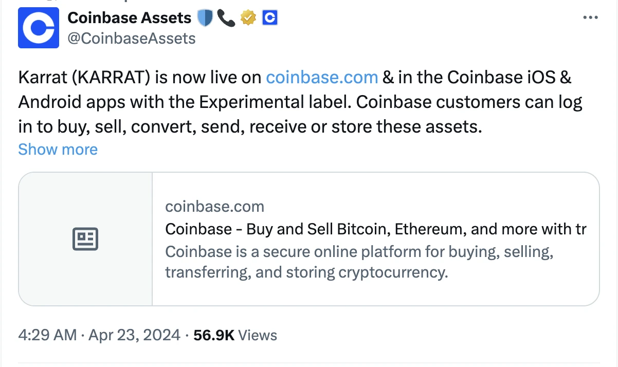 编者按: 4 月 22 日, Coinbase Assets 发文宣布 ,Coinbase 将在以太坊网络(ERC-20 代币)上添加对 Karrat(KARRAT)的支持,一时间引发市场高度关注,以下为 KARRAT 协议相关情况的简单分享。