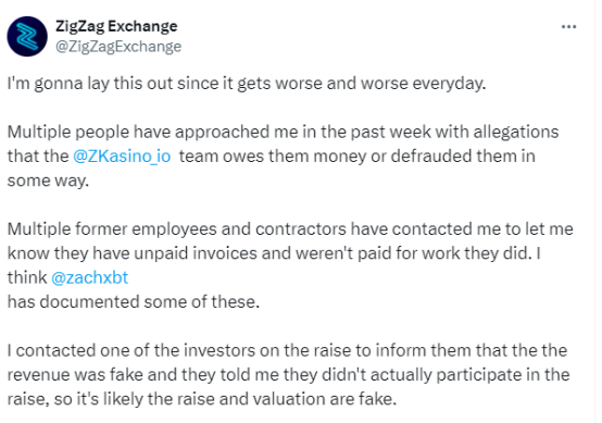 3月23日,ZigZag创始人Kedar突然在X平台上发文称,ZKasino的大部分收入都是伪造的(ZKasino声称上线第一年收入超900万美元),请用户谨慎参与他们的ICO活动。同时,ZKasino宣布的4000万美元生态系统基金不是真的,而且可能永远不会以任何实际货币支付。同时,Kedar指出Derivatives Monke侵吞ZigZag融资资金,并且最近有多人向其指控ZKasino团队拖欠款项或以某种方式诈骗,还有多名前员工和承包商表示未获得工作报酬。