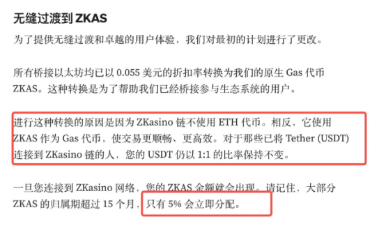 与该公告类似,项目白皮书也被篡改,不仅将用户质押资产改为修改为捐赠模式,还强制IDO,将用户质押的ETH全部转换为自身平台代币$ZKAS,且变为了霸王条款,代币返还期超过15个月,仅有5%会立刻分配。