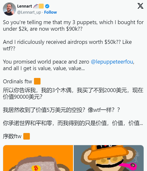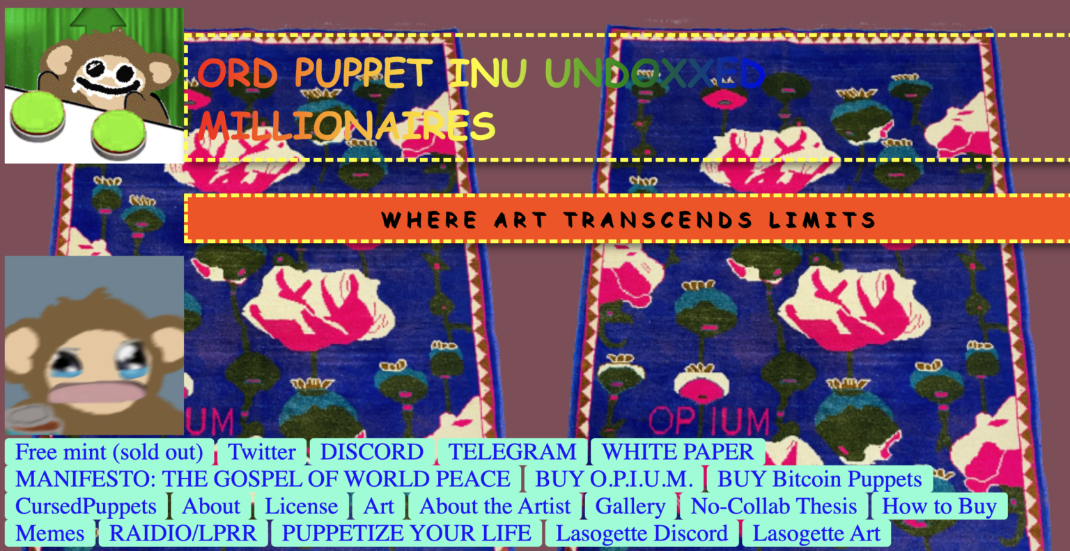 在创建比特币木偶之前,木偶大师已经制作了诸如 Lasogette 之类的收藏品,由 7, 777 个生成 PFP 的艺术美学,发行在以太坊网络上,以及 Ord Puppet Inu Undoxxed Millionaires(O.P.I.U.M.),这是组成的深奥而荒诞的收藏品,这发行成了 OrdinalsNFT。