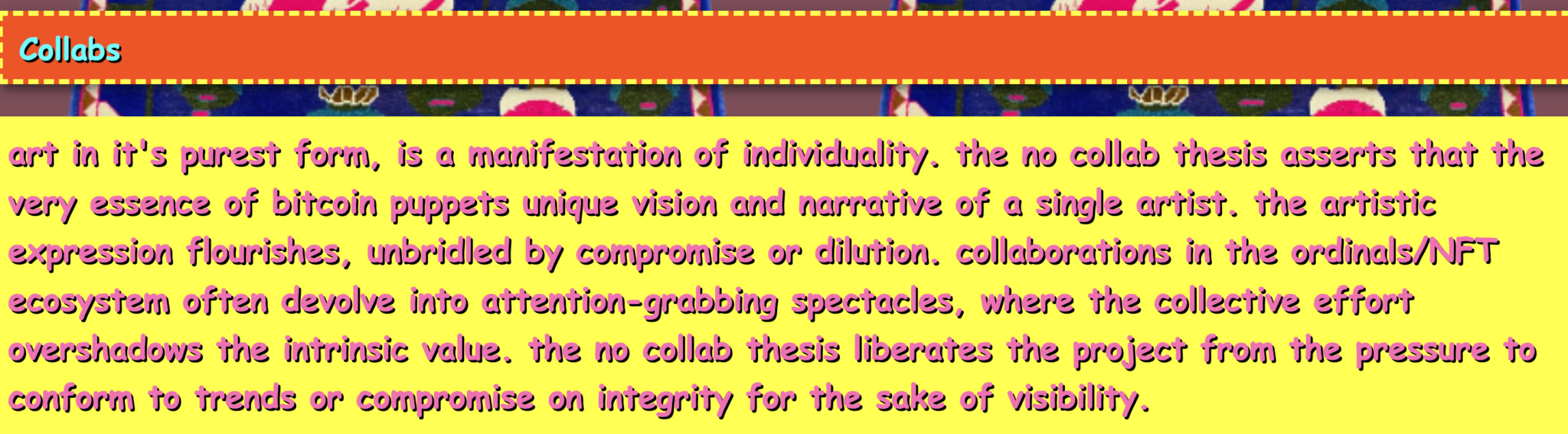 木偶大师颠覆了这种说法。没有路线图,没有承诺,没有董事会。他既没有成为聚光灯下的焦点,也没有消失在虚空中。他只是将自己定位为一个稳定、支持的存在,让持有者形成最适合他们的艺术和彼此之间的联系。如果你稍微留意一下,你会发现一些巧妙设置的彩蛋,比如网站上的中指光标或 O.P.I.U.M.白皮书的诗意怪癖,这些都是温柔的提醒,它温柔地提醒我们不要把自己看得太重。
