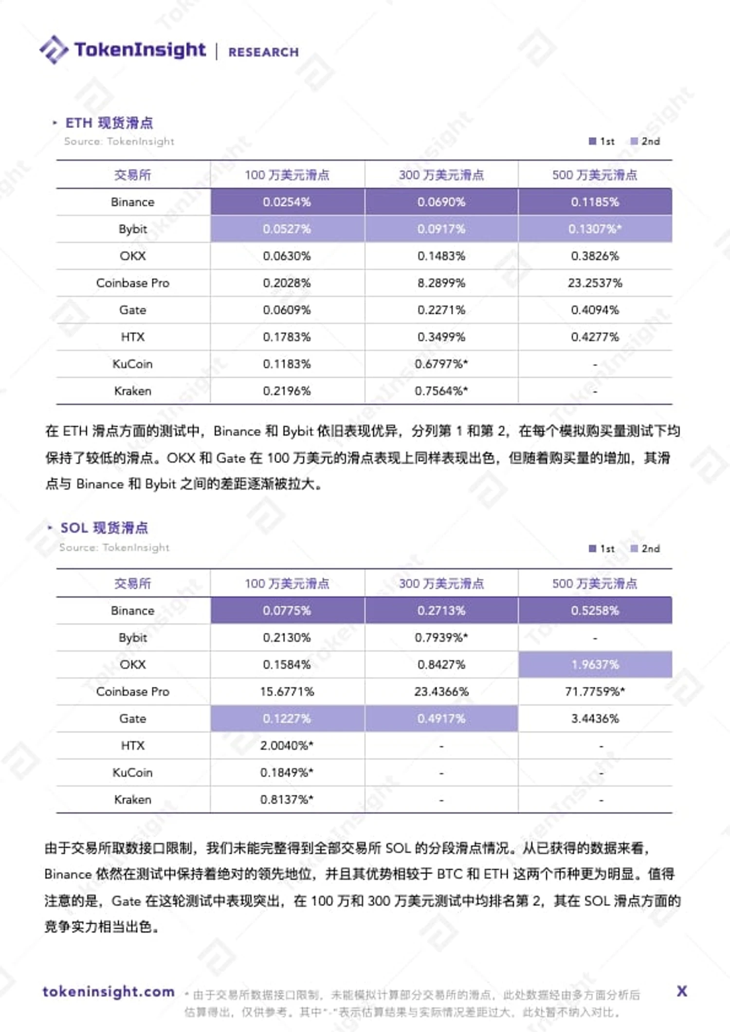 Binance 在 SOL 滑点上的优势相较于 BTC 和 ETH 更为明显。Gate 在 100 万和 300 万美元测试中排名第 2 。