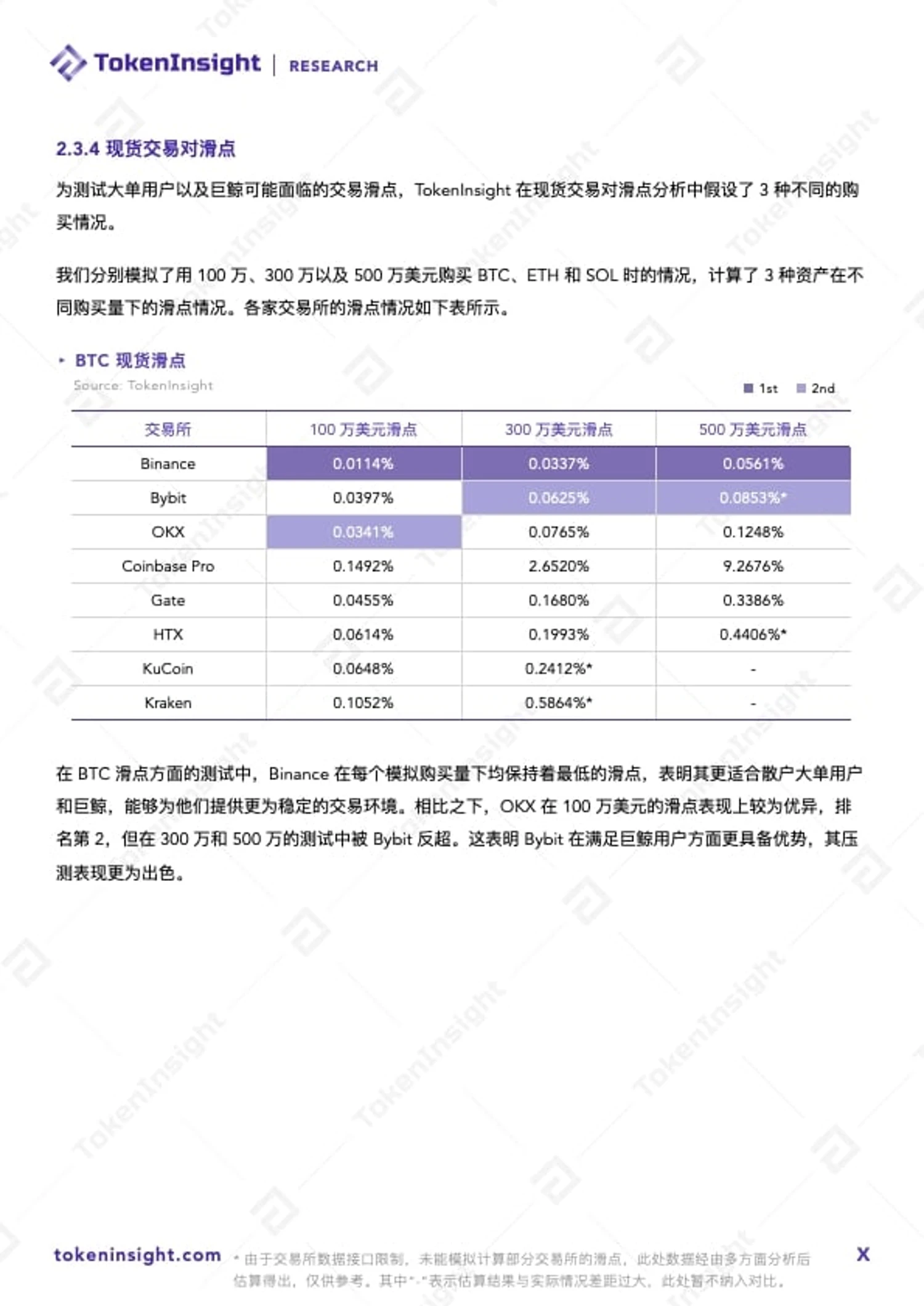 TokenInsight 在对现货币对滑点的分析中模拟了用 100 万、 300 万以及 500 万美元购买 BTC、ETH 和 SOL,计算了在不同购买量下的滑点情况,结论如下: