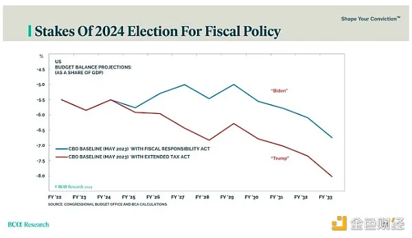 上图估计了 2024 年以来拜登或特朗普担任总统期间的赤字。 正如你所看到的,特朗普的支出预计会比拜登还要多。 特朗普正在寻求另一轮减税,这将进一步扩大赤字。 无论选择哪一位老年小丑,请放心,政府支出不会下降。