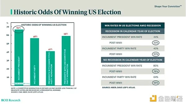 这是愚蠢的经济。 尚未决定选举获胜者的选民根据他们对经济的看法来决定。 如上图所示,如果选举年期间公众认为经济陷入衰退,现任总统的连任几率将从 67% 降至 33% 。 一个掌握货币和财政政策的执政党如何确保不出现衰退?
