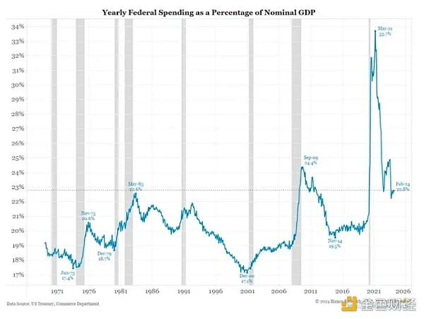名义 GDP 增长直接受到政府支出的影响。 从这张 Bianco Research 图表中可以看出,美国政府的支出占名义 GDP 的 23% 。 这意味着执政党可以随心所欲地印制 GDP,只要他们愿意借足够的钱来满足所需的支出水平。