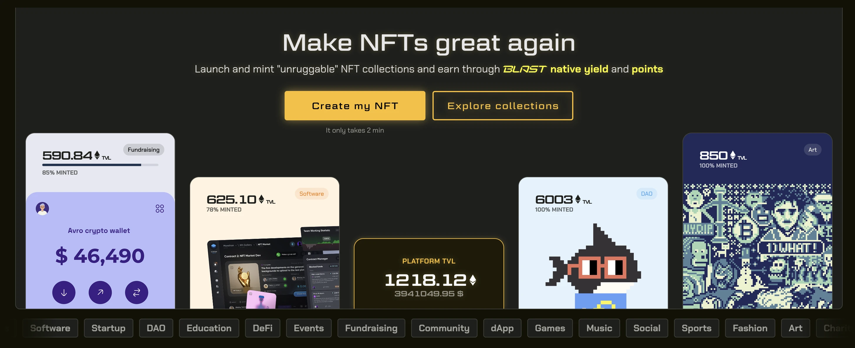 再比如,本期获得了 9 万“黄金积分”但 TVL 仅有数百万美元的 NFT 项目 BLASTR 提供了一种可退款的 NFT 铸造机制,并承诺会向 社区分发 100% 的“黄金积分”,其中 50% 会分发给 NFT 的创作者,但要求该 NFT 系列至少要有 100 个持有者,且铸造合约内的资金(可退款)要超过 5 ETH。 对于无法达到创作者门槛的普通用户而言,也可以选择那些承诺会将“黄金积分”分发给铸造者的 NFT 系列 来组队刷分。