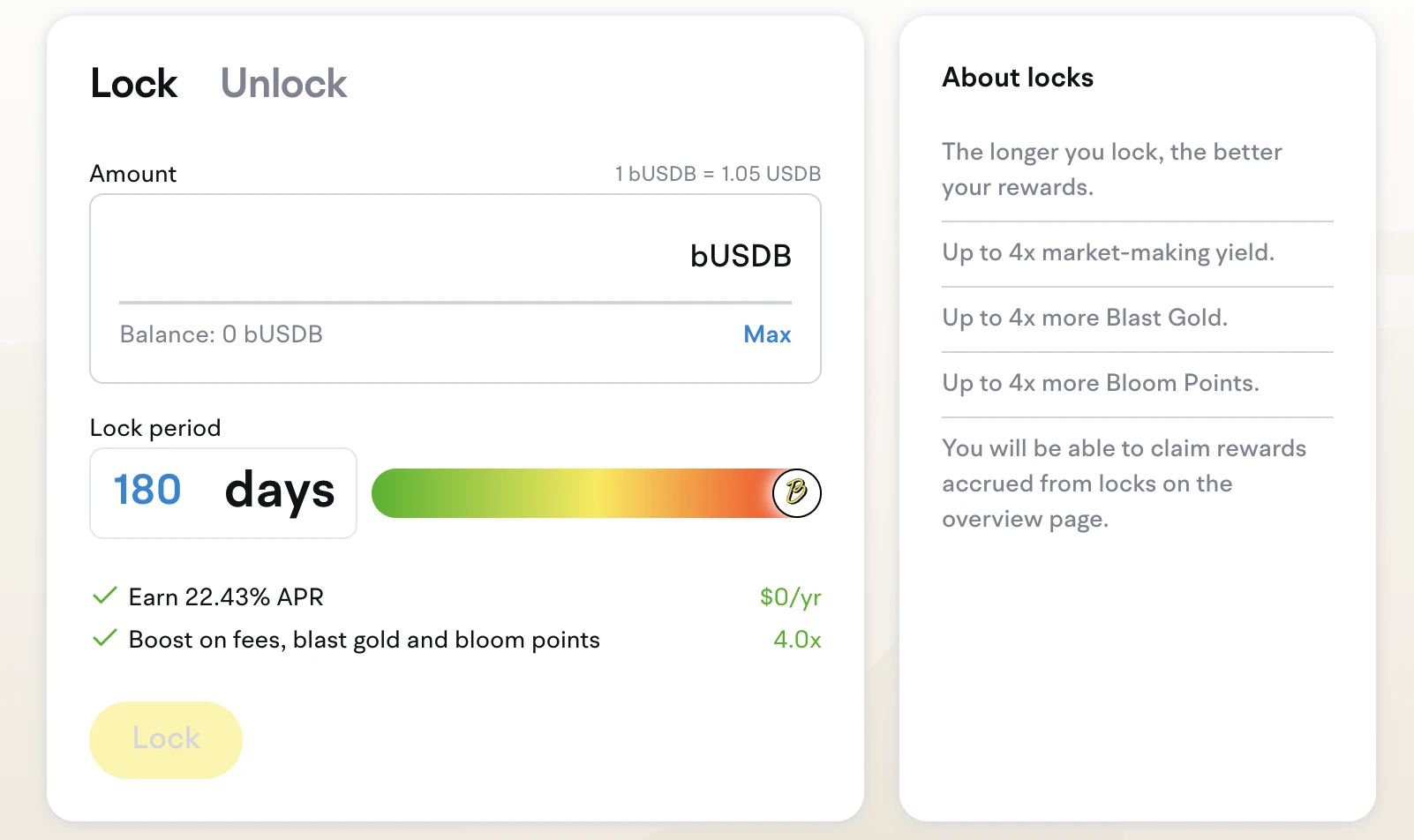 此外,一些协议内部也会通过锁仓等条件对不同用户进行不同幅度的激励,比如前文表格中提到的衍生品项目 Bloom ,在该平台进行做市可选择性地进行 30 天至 180 天不等的锁仓时限(也可以选择不锁),从而相对于普通用户获得 1.2 倍到 4 倍的积分(包括“黄金积分”)增益,但该玩法仅适合对流动性要求不高的用户,且不建议用户大资金参与。
