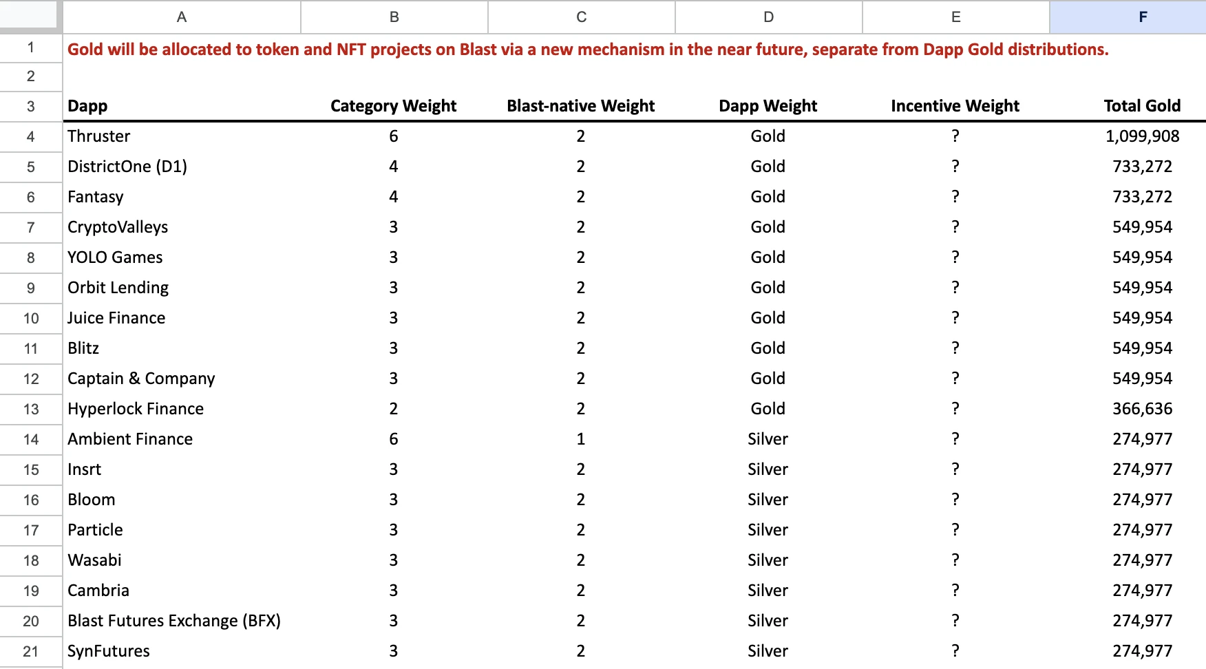 相较于第一期分配机会,本期“黄金积分”的分配总额(1000 万)并未发生变化,但入选项目的数量却已减半(第一期为 140 个),且 Blast 在本期分配中引用了全新的算法 —— 赛道权重(用以评估赛道对生态的重要性)* 原生级别权重(用以评估项目与 Blast 生态的绑定深度)* 应用设计权重(用以评估项目设计是否贴合 Blast 的特性) * 激励有效性权重(用以评估项目是否有效地分发了积分)。