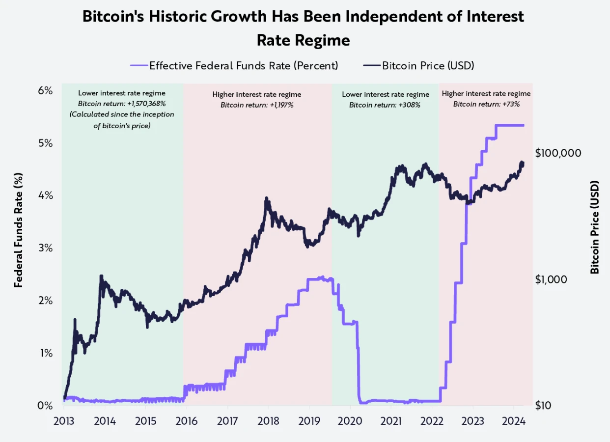此外,将比特币的价格与联邦基金利率进行比较,可以看出其在不同利率和经济环境中的弹性,如下所示。重要的是,无论是在高利率还是低利率制度下,比特币的价格都大幅上涨,如下所示。