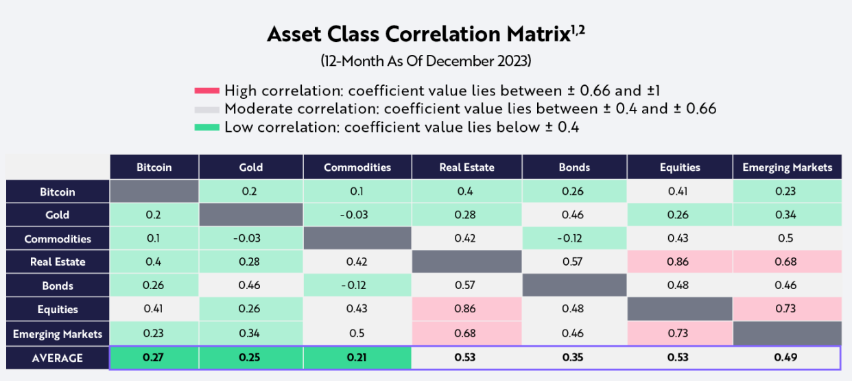 比特币适合作为避险资产的另一个原因是其收益与其他资产类别收益的相关性较低。比特币是少数几种相关性始终较低的资产之一,如下所示。2018 年至 2023 年间,比特币收益相与传统资产类别的相关性平均仅为 0.27 。重要的是,债券和黄金(传统上被认为是避险资产类别)之间的相关性相对较高,为 0.46 ,而比特币收益与黄金和债券收益的相关性分别为 0.2 和 0.26 。