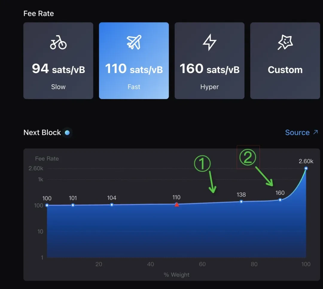 先看 Mempool 里,距离上个出块超过 5 分钟以上,而且我打的这个票进度还不到 60% 的话,我大概选图中 ① 这个位置的费率(就是中间的推荐费率再往右一点点的水平,大概 70% 的位置)