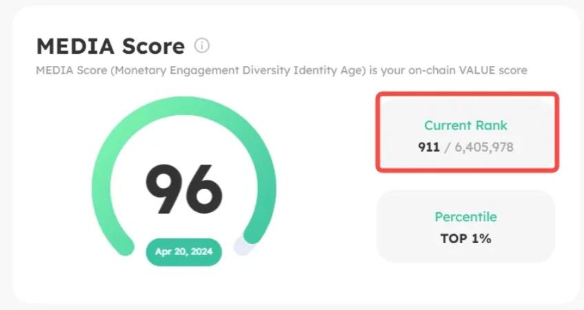 那么遵循 Starknet 基金会的做法(奖励 50 万个唯一用户地址,不包括开发人员等),使用 Trusta zkSync MEDIA 声誉评分进行排名,这是针对链上地址的代币、参与度、多样性、身份和年龄科学评分的组合。TrustGo 给出的排名第 500, 006 的地址为:
