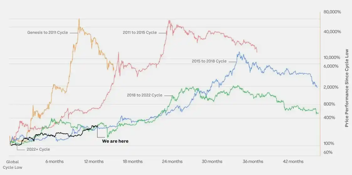 比特币在牛市中历史上表现出指数增长,价格在低点的基础上多次猛涨。当前的牛市周期始于 2022 年 11 月,价格已达到低点的 4 倍。正如图表所示,之前的两个牛市(2015 年至 2017 年和 2018 年至 2021 年)分别看到价格上涨了 100 倍和 20 倍。