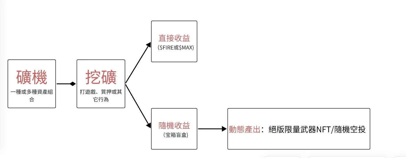 玩家持有矿机参与游戏挖矿,MATR1X FIRE 产出的直接收益是$FIRE 代币,同时可获得宝箱。
