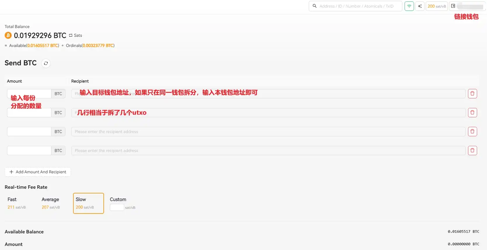 使用者进入网站后可在右上角连结钱包;点选「Add Amount And Recipient」增加行数,每增加一行意味著新增一个 UTXO;并在 Amount 填入每个 UTXO 的数量,在 Recipient 填入接受 UTXO 的地址。