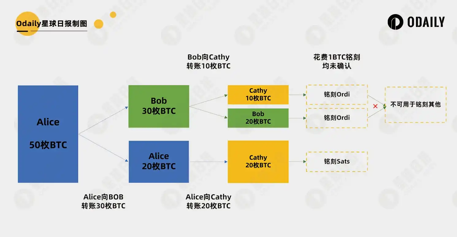 例如 Cathy 和 Bob 均铭刻了 Ordi 并且都未确认,由于 Bob 没有其他 UTXO,因此无法进一步操作,而 Cathy 能够使用另一个 UTXO 发起交易。