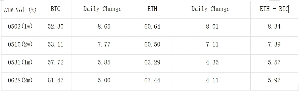 除此之外,BTC 五月底 70000-80000 美元行权价附近有一些看涨期权逢低建仓,更 Deep OTM 看涨期权的抛售主要来自大宗平台的客制策略,卖五月 110000 Call 的同时连带买下了等量六月的 110000 vs 160000 Call Spread。
