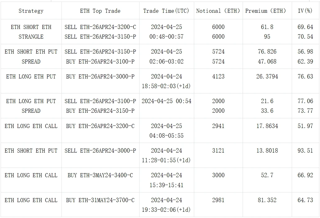 期权方面,IV 整体水平再度暴跌,BTC 和 ETH 的周期权延续了昨日的抛压,IV 下跌 8% 左右,其中 ETH 集中在 26 APR 24 3000-3200 行权价内的成交几乎包揽了过去一日 ETH 的所有交易量,BTC 则是在 ATM 和 Wing 上都有抛售。