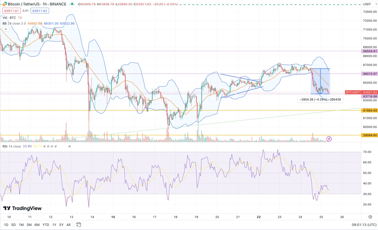 受新一轮中东地缘政治消息影响,比特币日内跌幅超过 4% ,最低点触及 63606 ,并在 64000 附近形成支撑位。