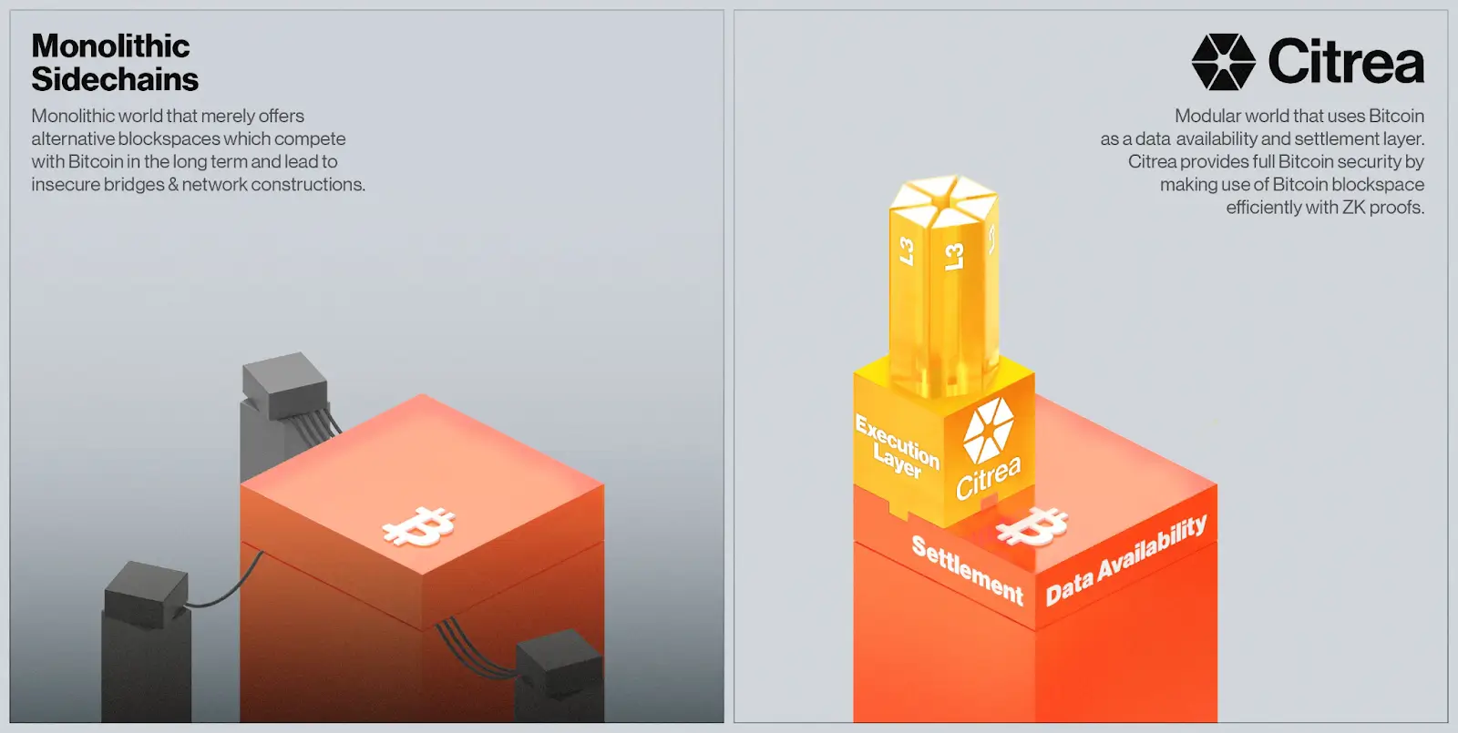值得注意的是,Citrea 是一个 Rollup,而不是一个侧链,就像大蒜与洋葱是同一家族但完全不同一样。它的目标是扩展区块空间而不是交易吞吐量——也就是说,它专注于更有效地存储区块链信息,而不是第二层上处理的交易数量。