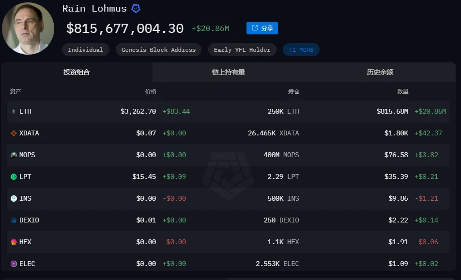 位居第二的是 LHV 银行创始人 Rain Lohmus,持有价值 8.15 亿美元的加密货币。 Lohmus 钱包最多的是 ETH(8.15 亿美元)和 Xdata(1800 美元)。