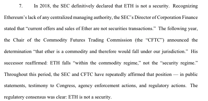 美国证券交易委员会(SEC)曾经声明以太坊(ETH)不是证券。2018 年,SEC 员工 William Hinman 发表了一次演讲,澄清 ETH 并不构成监管规则下的证券。“识别到以太坊缺乏任何集中管理权力,SEC 公司财务部门主任声明,‘当前的以太坊销售并非证券交易’,”诉讼中提到。“Hinman 关于 ETH 的表述反映了 SEC 及其领导层的深思熟虑的判断。”