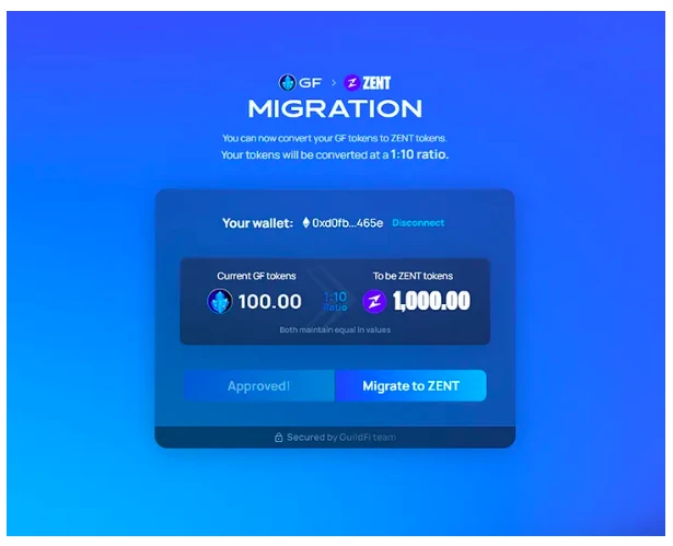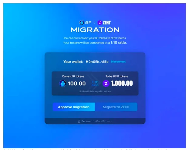 GuildFi 的代币 GF 迁移已于 2024 年 4 月 25 日开始,截止日期为从开始日期起的 4 个月。预计将在 2024 年 8 月 25 日完成代币迁移。迁移方式分为三种: 1、GF 持有者可以访问 GuildFi 的网站手动迁移。 2、如果持有者将其 GF 代币存放在中心化交易所(CEX)如 OKX 或 BitKub 上,交易所将自动进行代币迁移。3、在平台质押的 GF,GF 抵押者将继续获得奖励,并且在代币迁移完成后不久将提供有关迁移到 ZENT 抵押的进一步详细信息。