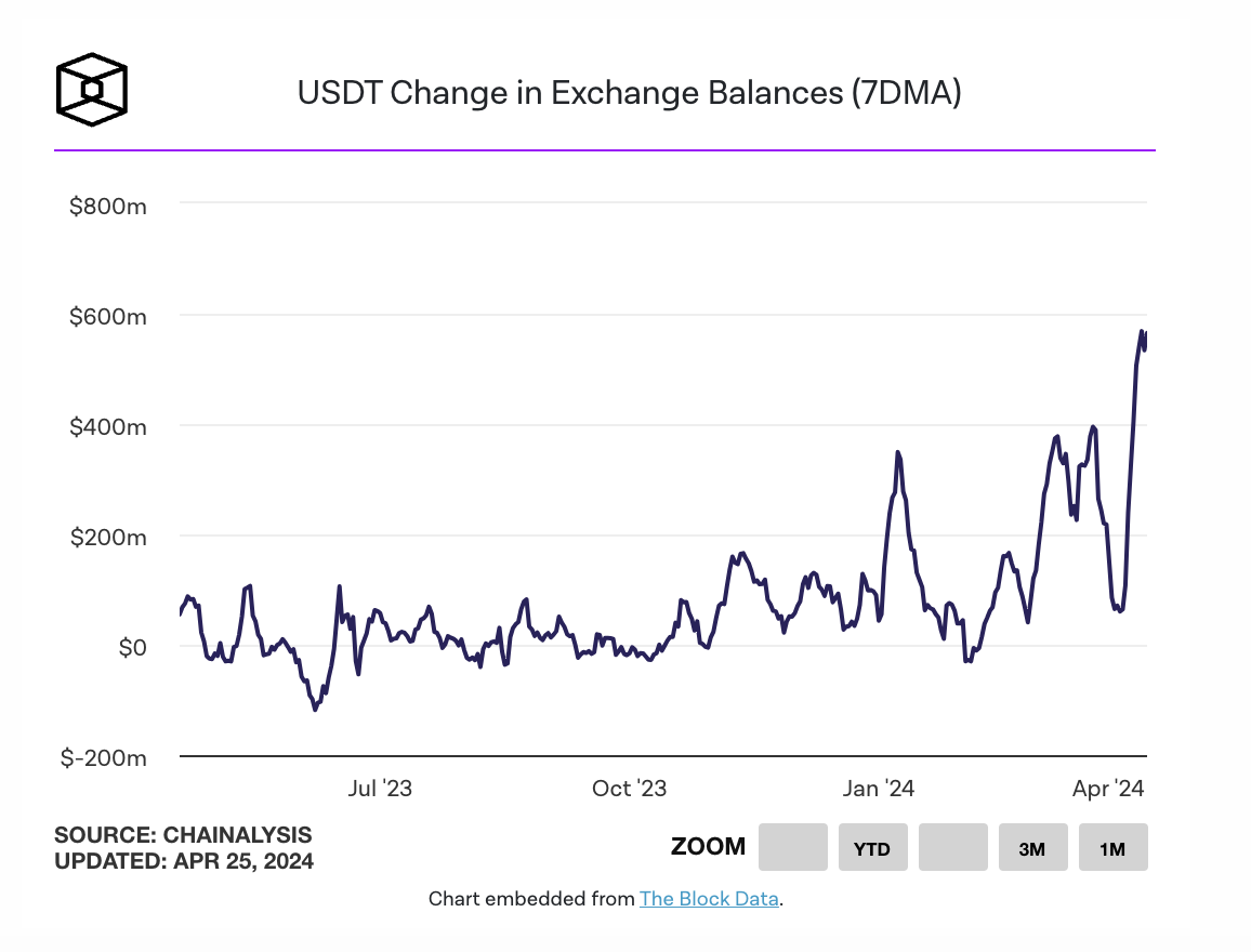 自 2 月初以来,此指标一直保持正值,表明交易所的 USDT 持有量持续增长。