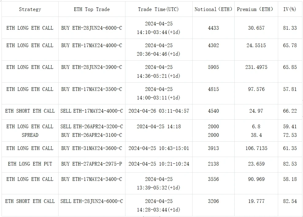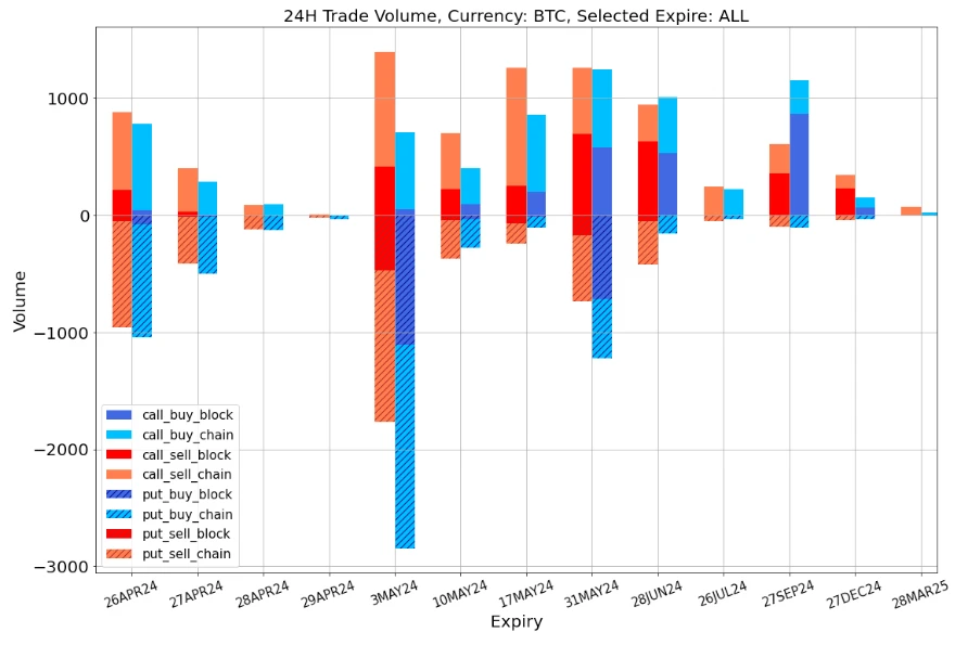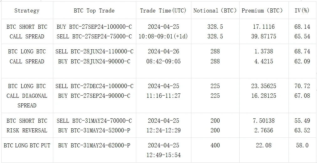 数字货币方面,近期 BTC 和美股的相关性得到强化,币价在美盘开盘阶段一度下探至 63000 下方,吸引到 BTC 次周 59000-P 和 60000-P 大量买单成交。大宗方面,BTC 成交分布向远期转移,买卖 OTM CallSpread 和几组三角价差策略表现出对上行空间的博弈;ETH 多为看涨期权买入,并分布在 17 MAY 24 和 28 JUN 24 0.25 Delta 附近的行权价上。