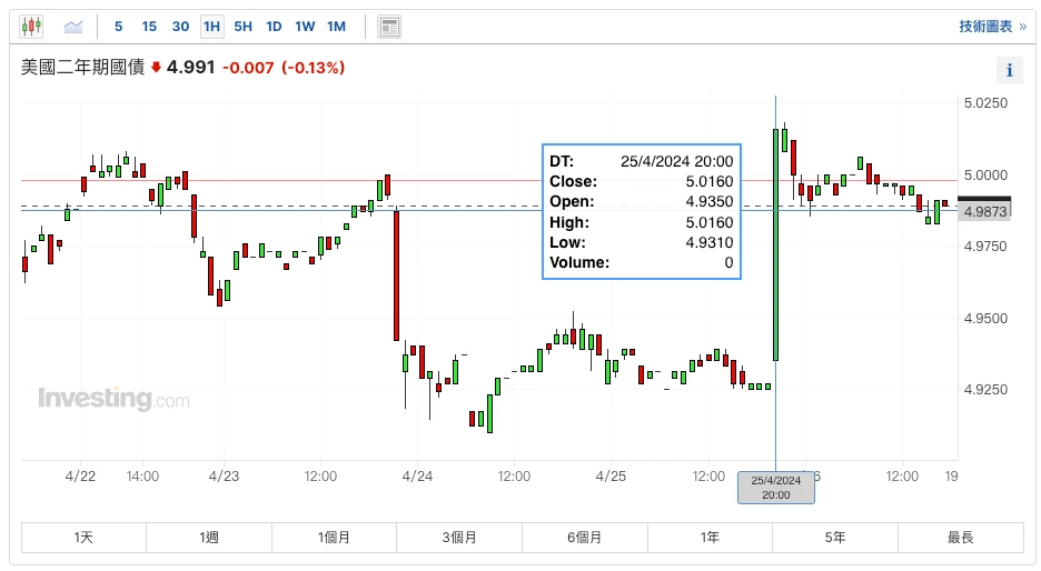 昨日(25 APR)美国第一季度 GDP 大幅低于预期,同时 PCE 物价指数大幅反弹录得 3.7% ,预示着今晚公布的 PCE 通胀指数大概率将高于市场之前的预测。经济产出疲软加上物价上涨,对风险情绪造成打击,三大指数应声下跌,对利率政策敏感的两年期美债收益率一度跳涨至 5.016% ,日内逐渐回落到 5.0% 下方。美联储古尔斯比称,在一系列高于预期的通胀数据之后,美联储必须“重新调整”,“必须等待并观察”。