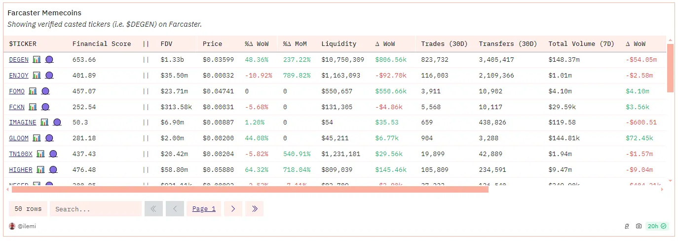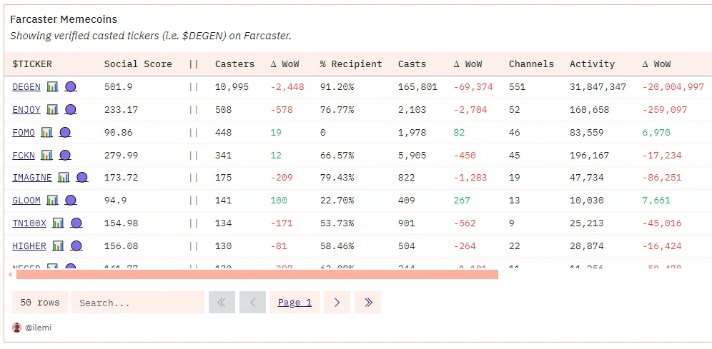 Farcaster 的 Meme 币(如 DEGEN)是最新的风格,其主要优点在于社交是完全开放的。因此,我想用一些基本的分析来测试一下社交和财务数据。