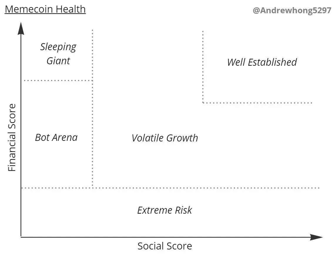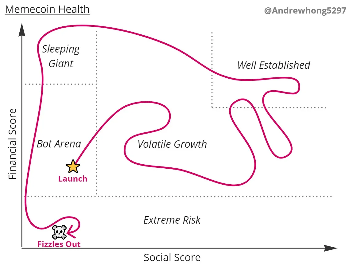 大部分 Meme 币应该被困在“机器人竞技场”中,有一些吸引人的 Meme 币位于“波动性增长”片段中,可能有一两个达到“已经建立”的 Meme 币。在这个过程中,一些可能会失去社交力量,成为“沉睡的巨人”,而另一些可能会失去财务支持(流动性),成为“极高风险”。