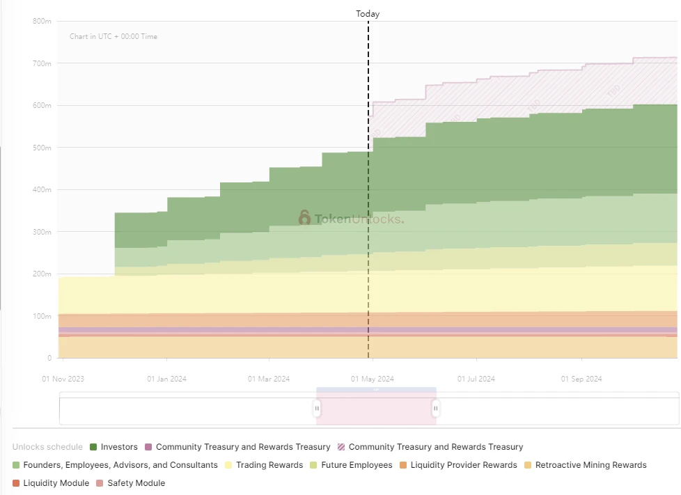 本次解锁为常规解锁,面向投资者以及项目方。其中投资者共 1849 万枚,价值 3930 万美元,面向创始人、雇员、顾问的解锁共 1485 万枚,价值 3160 万美元。
