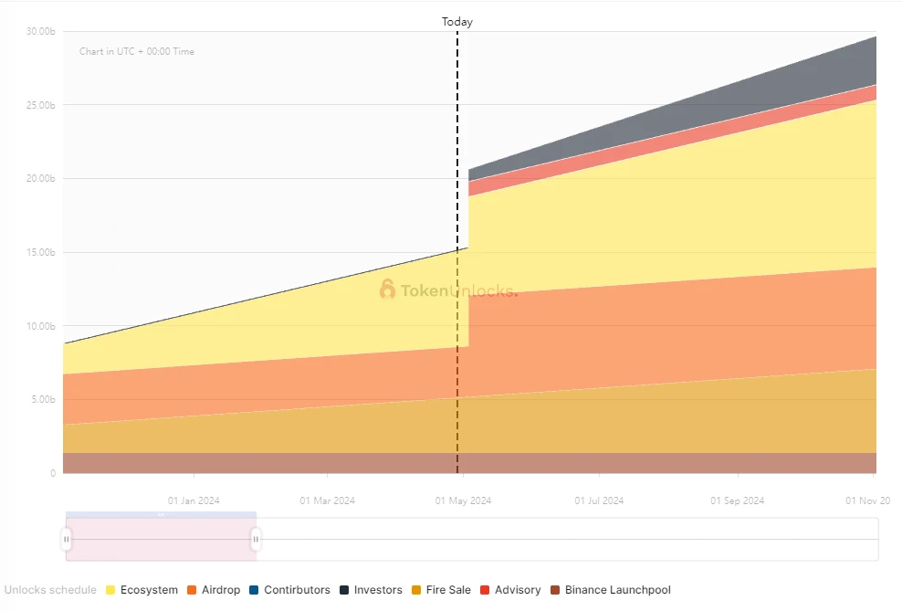 本次解锁为 MEME 上线以来的首次 Cliff 解锁,其中占比最大的为空投部分,共 34.5 亿枚,价值近 1 亿美元。其余为顾问的 10.4 亿枚和投资者的 8.28 亿枚,分别价值 3000 万美元和 2350 万美元。