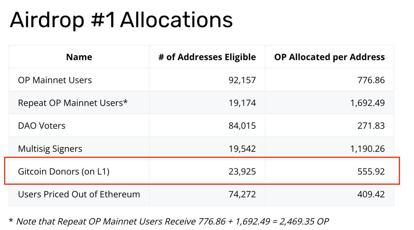 Optimism 是以太坊 Layer 2 ,第一轮空投将 OP 供应量的 5% 分配给 248, 699 个地址,其中包括 Gitcoin 捐赠者。