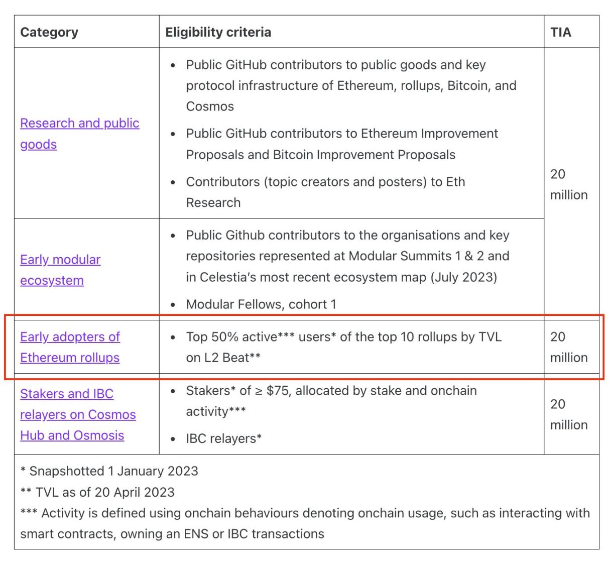 Celestia 是第一个模块化区块链网络,创世空投 6000 万枚 TIA (总供应量 6% ),其中 1/3 给以太坊 Rollups 早期活跃者。