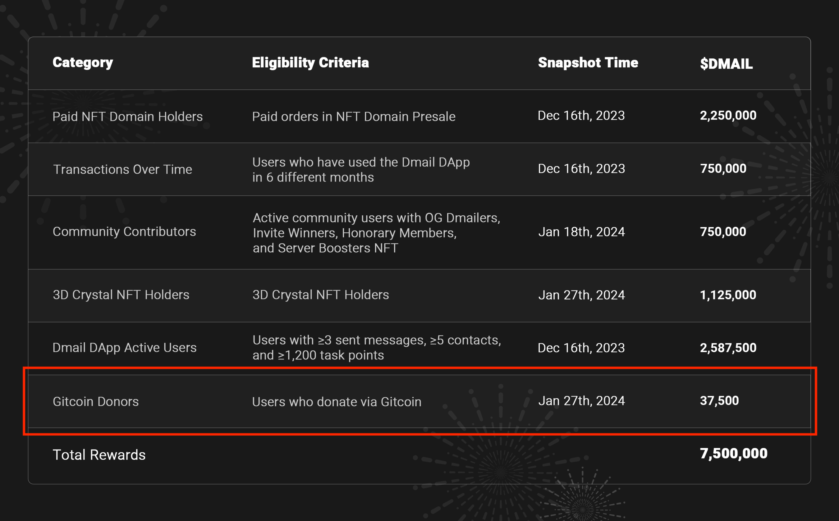在过去两轮 Gitcoin 捐赠中向 Dmail 捐赠 5 美元以上所有地址空投总量 3.75 万枚 DMAIL,如果是捐赠 ETH,将根据当时汇率(2268.26 美元 /ETH)换成美元。