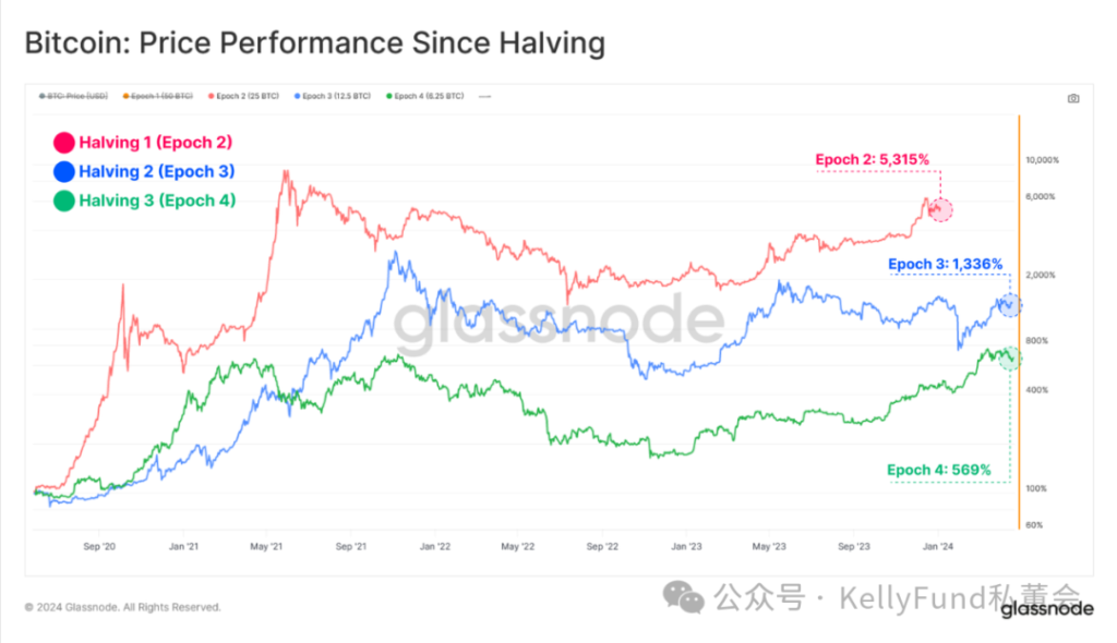 然而,需要尤其著重指出的是,当前周期是有史以来唯一一个价格在减半事件之前即宣告突破前一个历史价格峰值的周期。