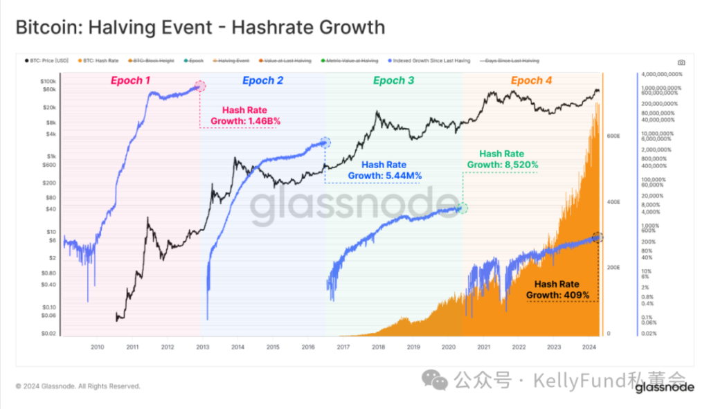 有趣的是,算力在每次减半事件中都处于或接近新的历史峰值,这表明当前可能会发生以下两种情况中的至少一种: